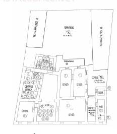 Intero edificio indipendente da ristrutturare, sviluppato su cinque livelli e con accesso dal cortile interno comune di un palazzo storico residenziale. L’edificio risulta così composto: a piano terra terrapieno; a primo piano cucina, stanza, w.c. vano scala; a secondo piano due stanze, wc e vano scala; soffitta a piano terzo, a piano tetto, tetto. Completano la proprietà una quota della p.m.13 identificata dal porticato, dalla scala e dal sottoscala a primo piano, nonché dal poggiolo e dalla scala a piano secondo, come indicativamente proposto nella bozza di variante al piano di casa materialmente divisa predisposta dall’esperto e riportata alle pagg. 6 e seguenti della relazione di stima. In comune a piano terra portico, cortile, atrio, vano centrale termica, vano scala e a primo piano altro cortile.